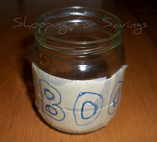 Using masking tape (or stickers) add a letter or image to each baby food jar. I decided for my first set to spell the word “Boo” using three jars. I wanted to make them semi-uniform so I put a couple strips of masking tape together on one jar, drew the word “Boo”, cut out each individual letters and then placed one letter on each jar.
