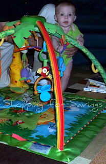 The battery life on this gym is also good; we haven’t had to replace them once in almost seven months, and Baby C. uses it a lot.  As you can see below, she was still loving it a couple of months ago when she wanted to start playing with it while standing up (with help from Grampie).